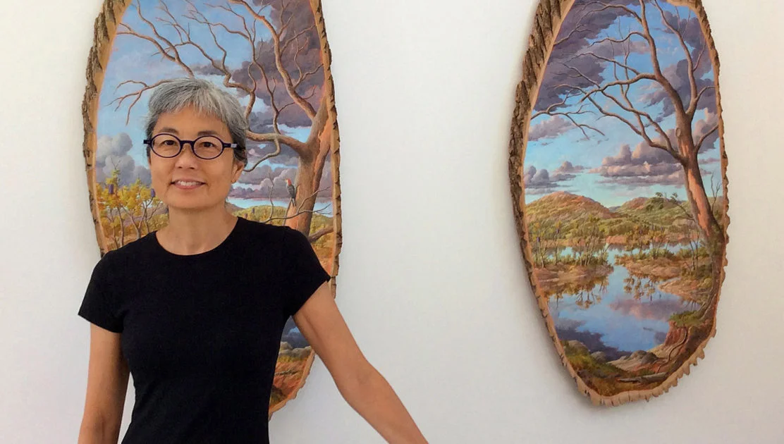 In your log paintings, you paint pristine natural landscapes on log slices. Any romantic ideas we might have about the landscape are undercut by the log canvas, which implies a disconnection between what we imagine and what’s real. Can you talk about that tension?